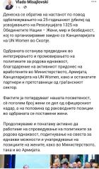 „Министерот за одбрана Владо Мисајловски заедно со претседателката Гордана Сиљановска – Давкова на 31 октомври се обратија на одбележувањето на 25 – годишнината од усвојување на Резолуцијата на 1325 на Обединетите Нации – Жени, мир и безбедност. Резолуција која според министерот за одбрана треба да донесе правична родова застапеност и создавање на еднакви услови за развој во кариера на жените и мажите во Министерството за одбрана и во Армијата.