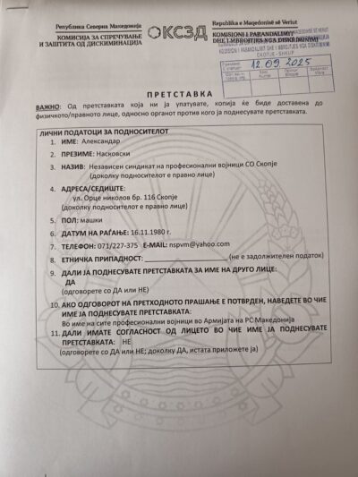 Поради оваа непроменлива ситуација која е на штета на кариерите и условите за работа на жените во Армијата , синдикатот поднесе претставка до Комисијата за спречување и заштита од дискриминација за утврдување на дискриминација врз основ на род – родова нееднаквост.