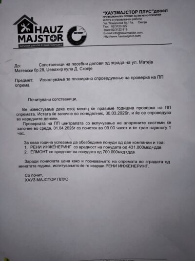 На 30 март 2026 година, управителот постави известување дека на 1 април ќе се спроведе тестирање на противпожарниот систем во трите кули со коишто управува фирмата Хауз Мајстор Плус, како и проверка и мерење на притисокот на противпожарните апарати по катовите.