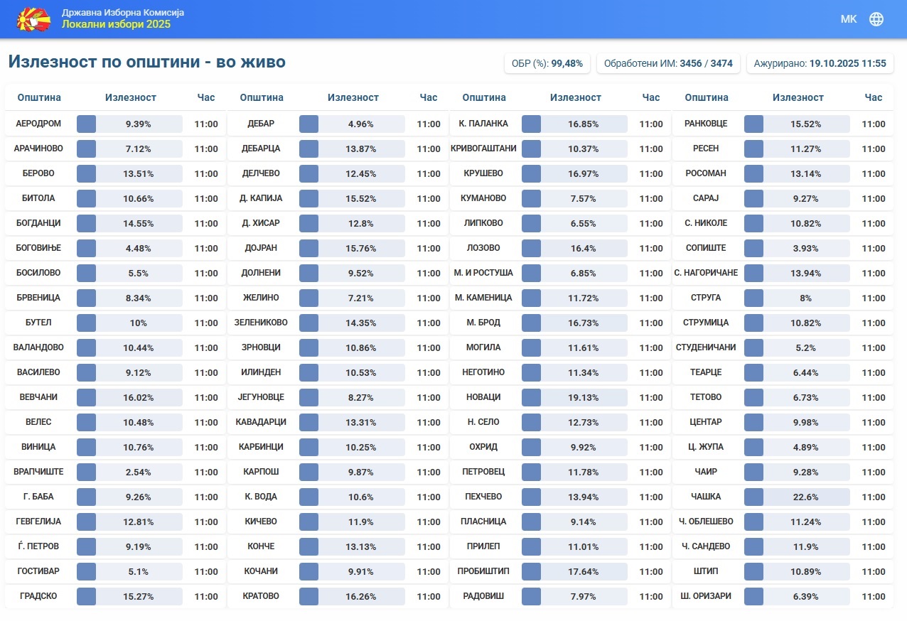 До 11 часот на странцата на ДИК се објавени податоци за одѕивот на граѓаните на Локалните избори од 3474 избирачки места, со обработени 3456 избирачки места, од вкупно запишани 1 832 415 гласачи, на овие избирачки места гласале 172 061 односно 9,44 проценти. Овој изборен процес го набљудуваат 1484 набљудувачи, од кои 807 домашни, 640 меѓународни и 14 странски новинари. Најголем одѕзив има во Пробиштип а најмај во Врапчиште.