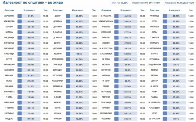 Овој процент е пресметан врз основа на обработени 3.444 избирачки места, што претставува 99,14% од вкупниот број.