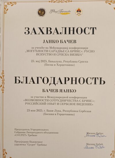Професорот Бачев учествуваше на големата научна конференција посветена на БРИКС каде го изложи својот труд насловен како “Политичкото значење на БРИКС за Македонија – можности и перспективи за воспоставување на поблиска соработка со цел заштита на македонските национални интереси”. Под модераторство на Милана Бабиќ претседателка на здружението „Сусрет“ во експертскиот дел уште зборуваа: Жељко Будимир, министер за научно технолошки развој и високо образование во владата на Република Српска и професор по политикологија на Факултетот за политички науки, Сулов Димитриј Вјачеславович заменик директор на рускиот Центар за сеопфатни европски и меѓународни студии, Ахмед Бин Сулајем генерален директор за општа трговија Дубаи и претседател на берзата за злато и дијаманти Дубаи, Јакушев Николај Олегович научен соработник во руската Федерална буџетска установа за наука, Драгана Митровиќ професорка на Факултетот за политички науки Белград, Ногеира Батиста поранешен потпретседател на ММФ и на Новата банка на БРИКС, Дантас Алексис Торибио професор на Економскиот факултет во Бразил, Ентина Екатерина Генадијевна универзитетски професор и извршна директорка на А.М. Горчаков, Котова Анастасија Романовна раководител на проектот за јавна дипломатија на “Горчаков” Јана Зубчук уредник на порталот ТВ БРИКС.