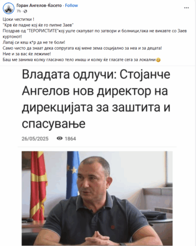 По повод новото директорко место на Стојанче Ангелов кој велеш крв ќе падне кој ќе го чепне Заев, се огласи на фејсбук уставобранителот Горан Ангелов Ќосето.