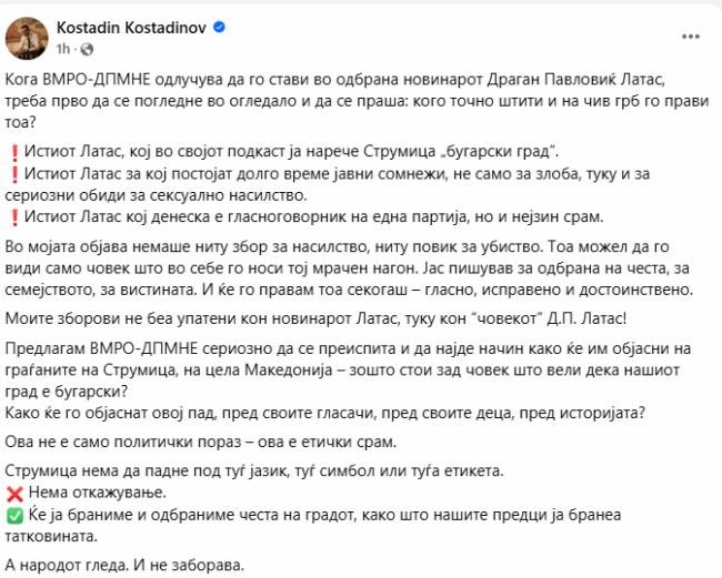 „Истиот Латас кој ја нарече Струмица ‘бугарски град’. Истиот за кого со години постојат јавни сомнежи за сериозни обвинувања. Тоа не е само политички пад, туку етички срам“, изјави Костадинов.