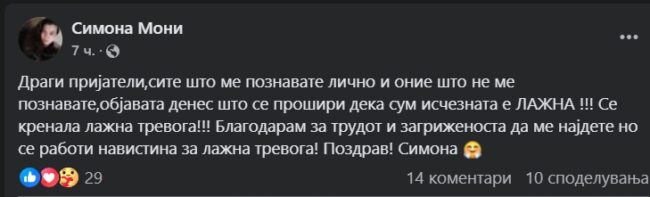 Објавата дека сум исчезната е лажна! Напиша на својот фејсбук-профил Симона Стојкова, девојката за која вчера беше објавено дека е исчезната и по која цела држава трагаше а воопшто не ни била пријавена за исчезната во полициска станица.