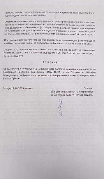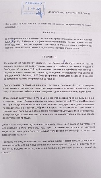 „Овие нови факти и докази се доволни за повторно отворање на главната расправа и конечно исправување на неправдата,“ стои во соопштението.