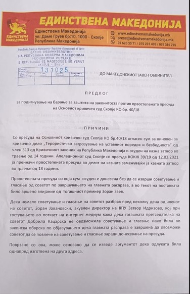 Единствена Македонија ја информира јавноста дека претседателот на Комисијата на Единствена Македонија за внатрешна безбедност, одбрана, правда и политички затвореници, Вилијам Михајловски – осуден на 13 години затвор за собраниските настани од 27 април – поднел два вонредни правни лекови: